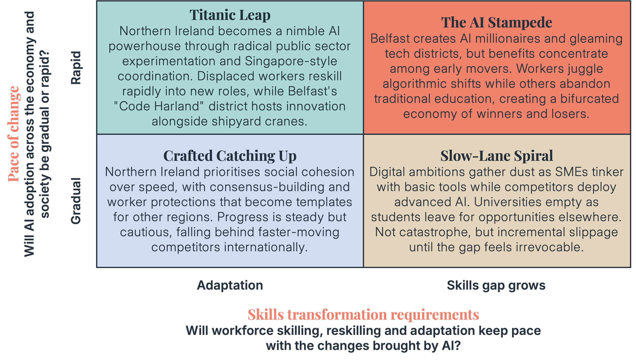 After a thorough landscape review and extensive stakeholder interviews, we developed a list of 12 drivers, that are likely to have a significant impact on AI and the future of work in Northern Ireland. We then ran a collaborative scenario planning exercise with key stakeholders from across industry, academia, and government, both within and outside Northern Ireland. Through the discussions, two drivers were selected as the key axes of uncertainty - the drivers which will have a high level of influence, but where there is a high degree of uncertainty regarding the range of possible outcomes. These were: